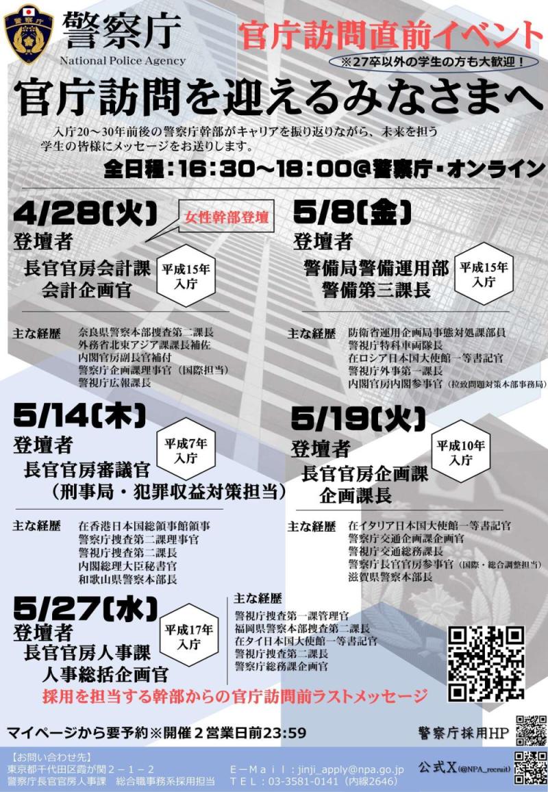 入庁20~30年前後の警察庁幹部がキャリアを振り返りながら、未来を担う学生の皆様にメッセージをお送りします(27卒以外の学生の方も大歓迎です!)。
