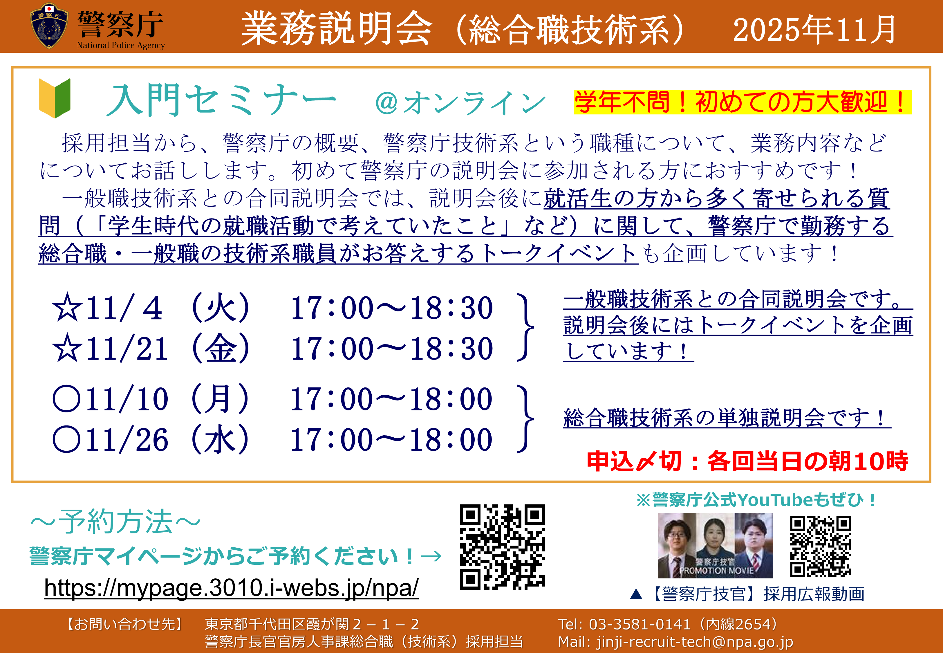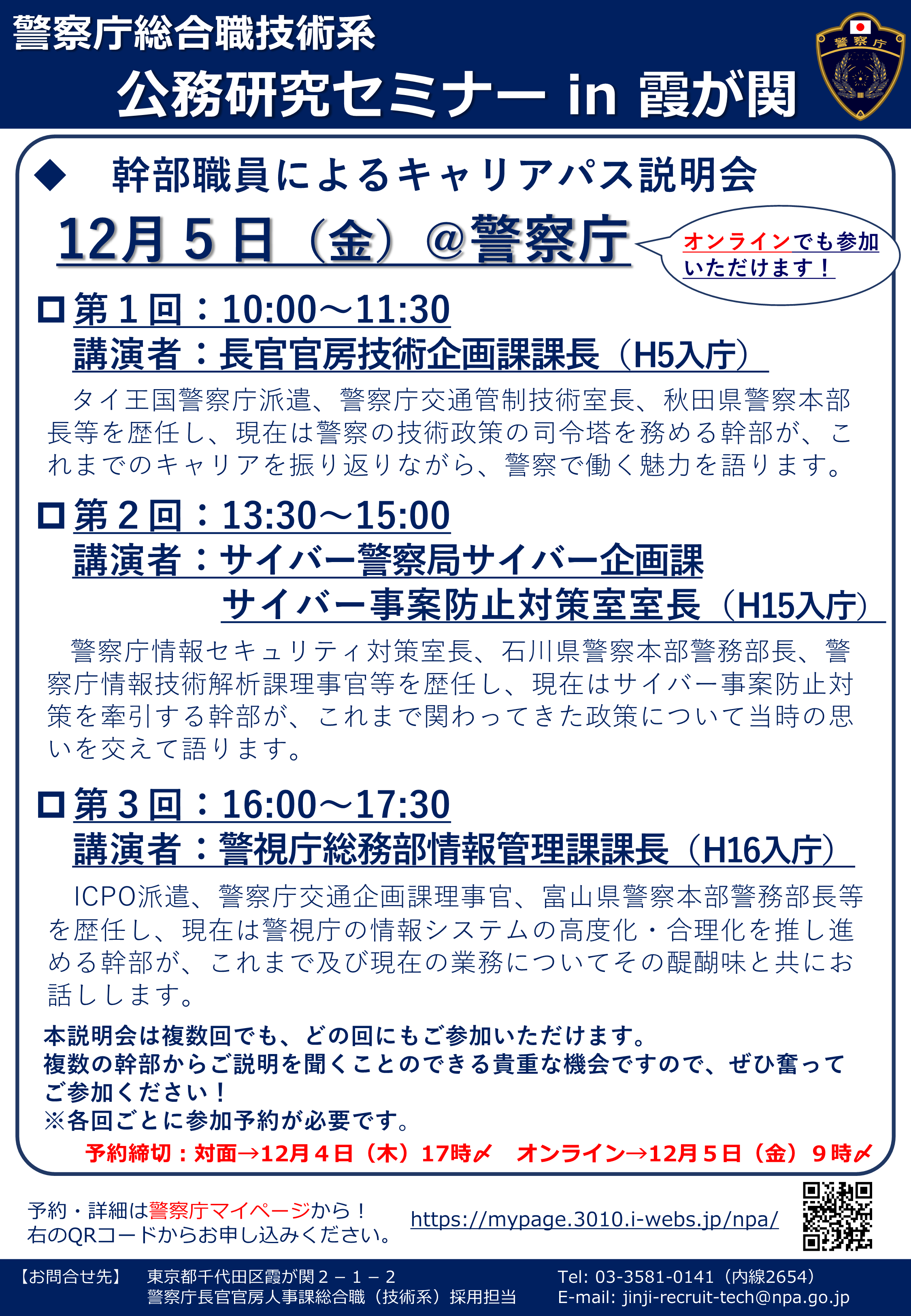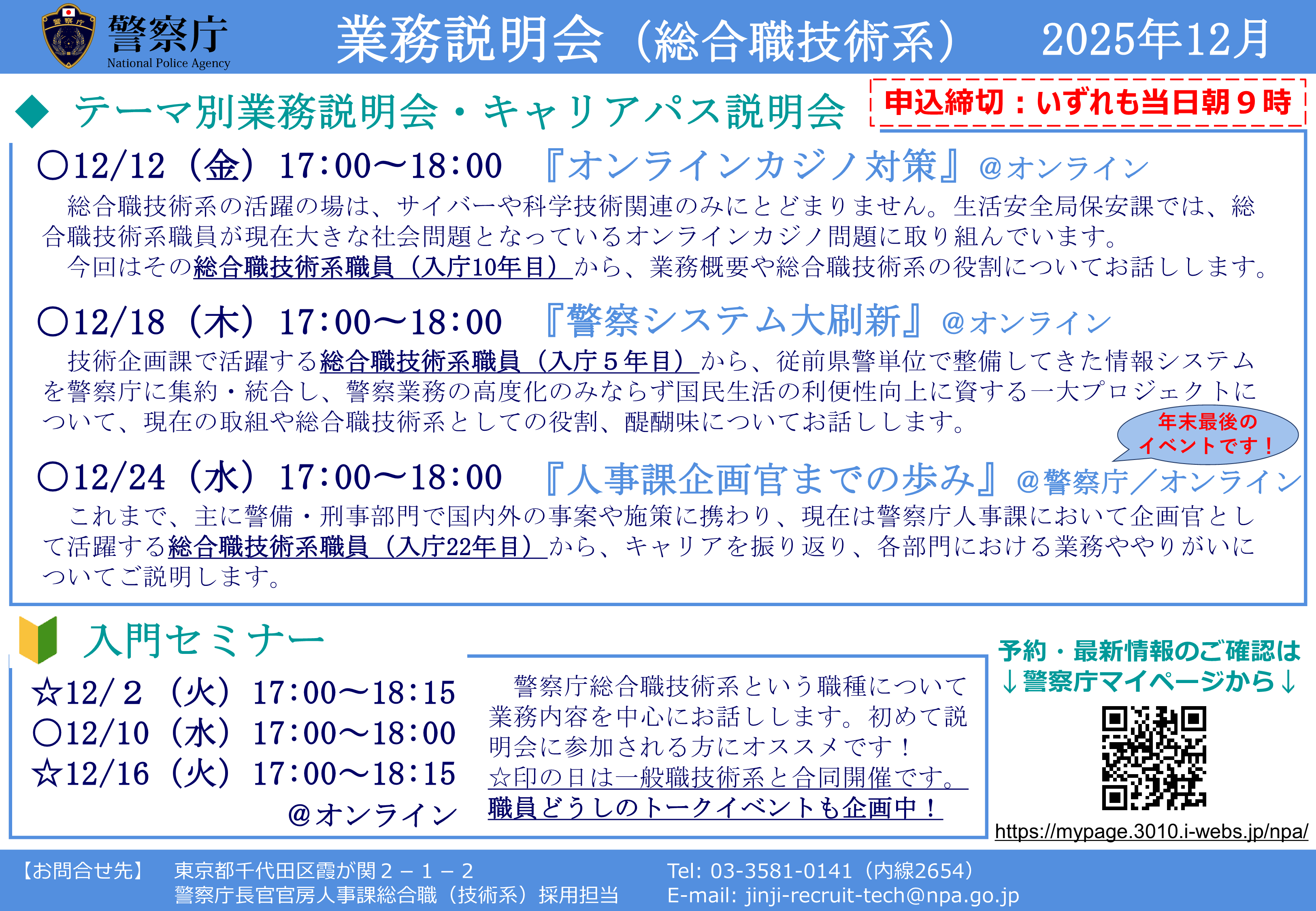 本イベントは、警察庁総合職技術系の業務への理解を深めていただくことを目的としたものであり、採用選考プロセスとは一切関係ありません。