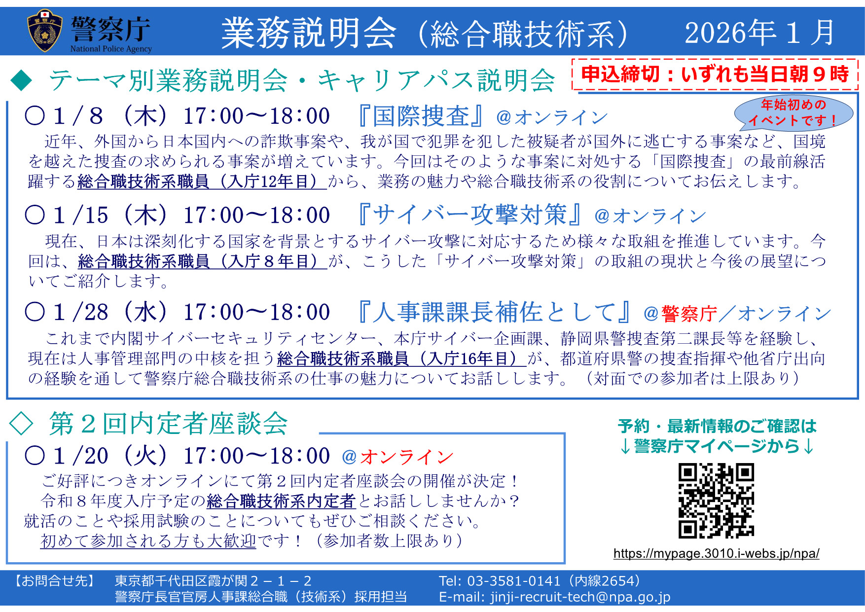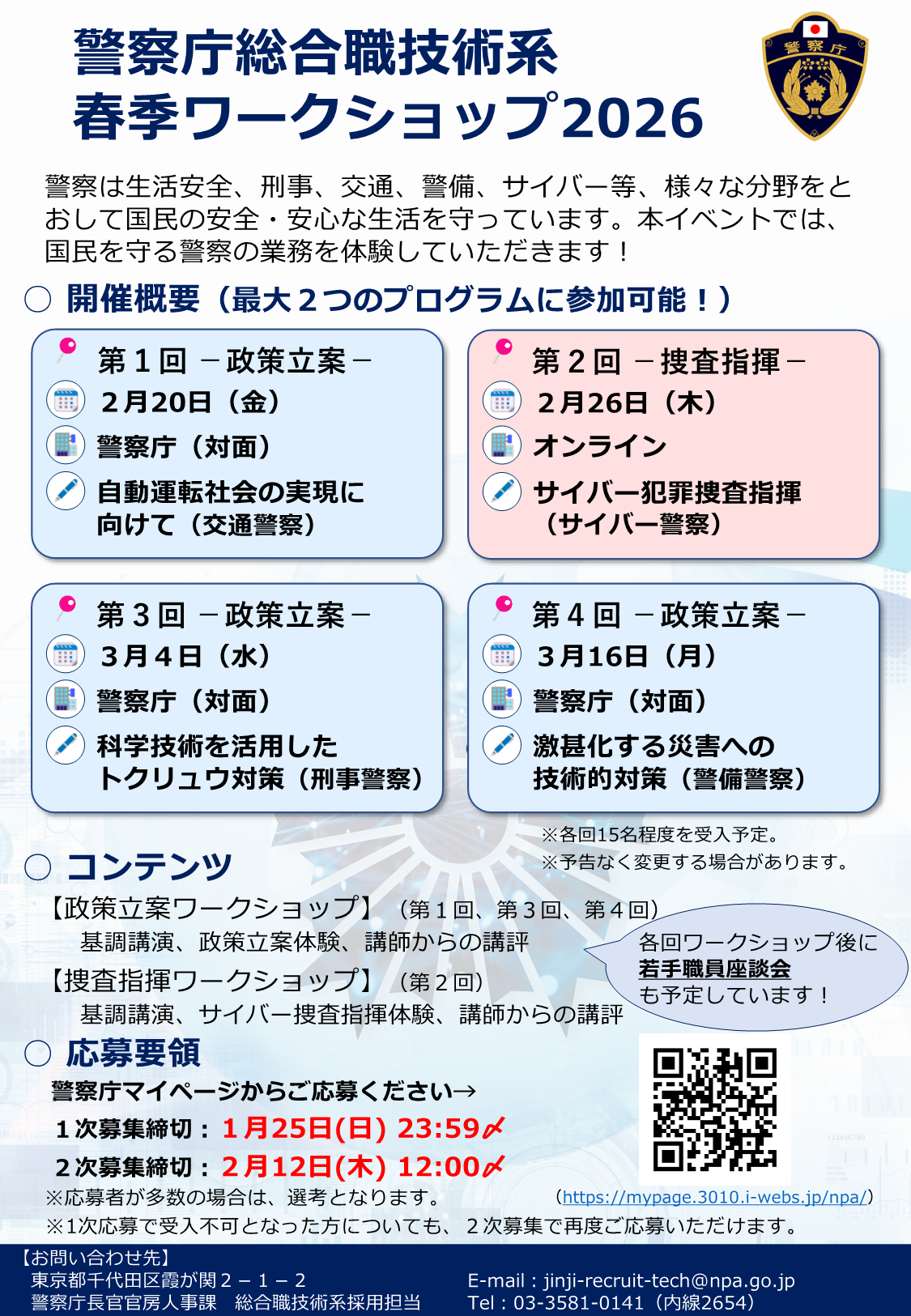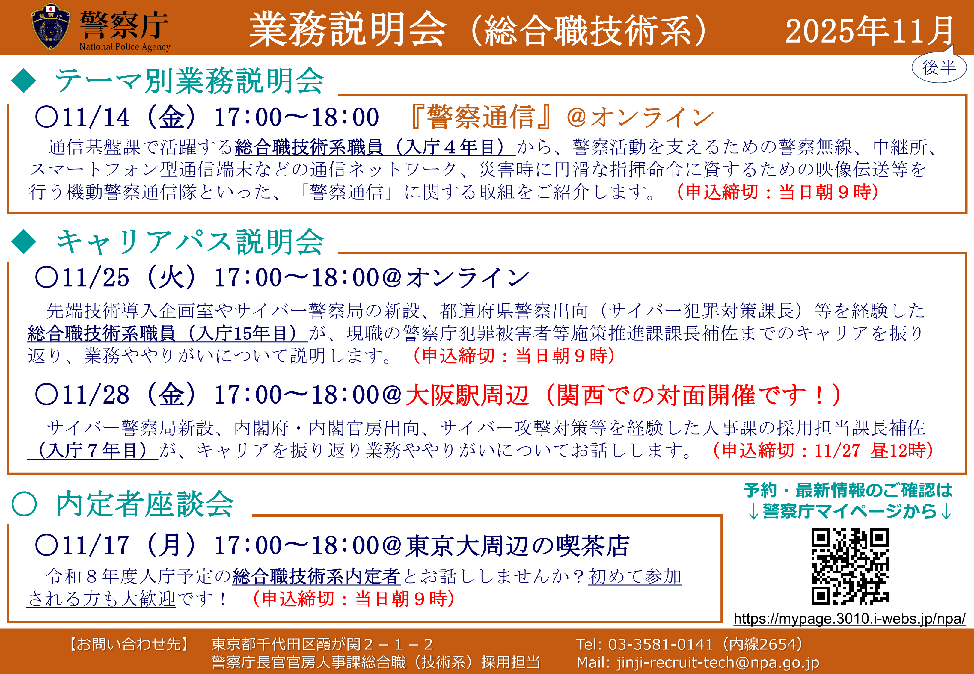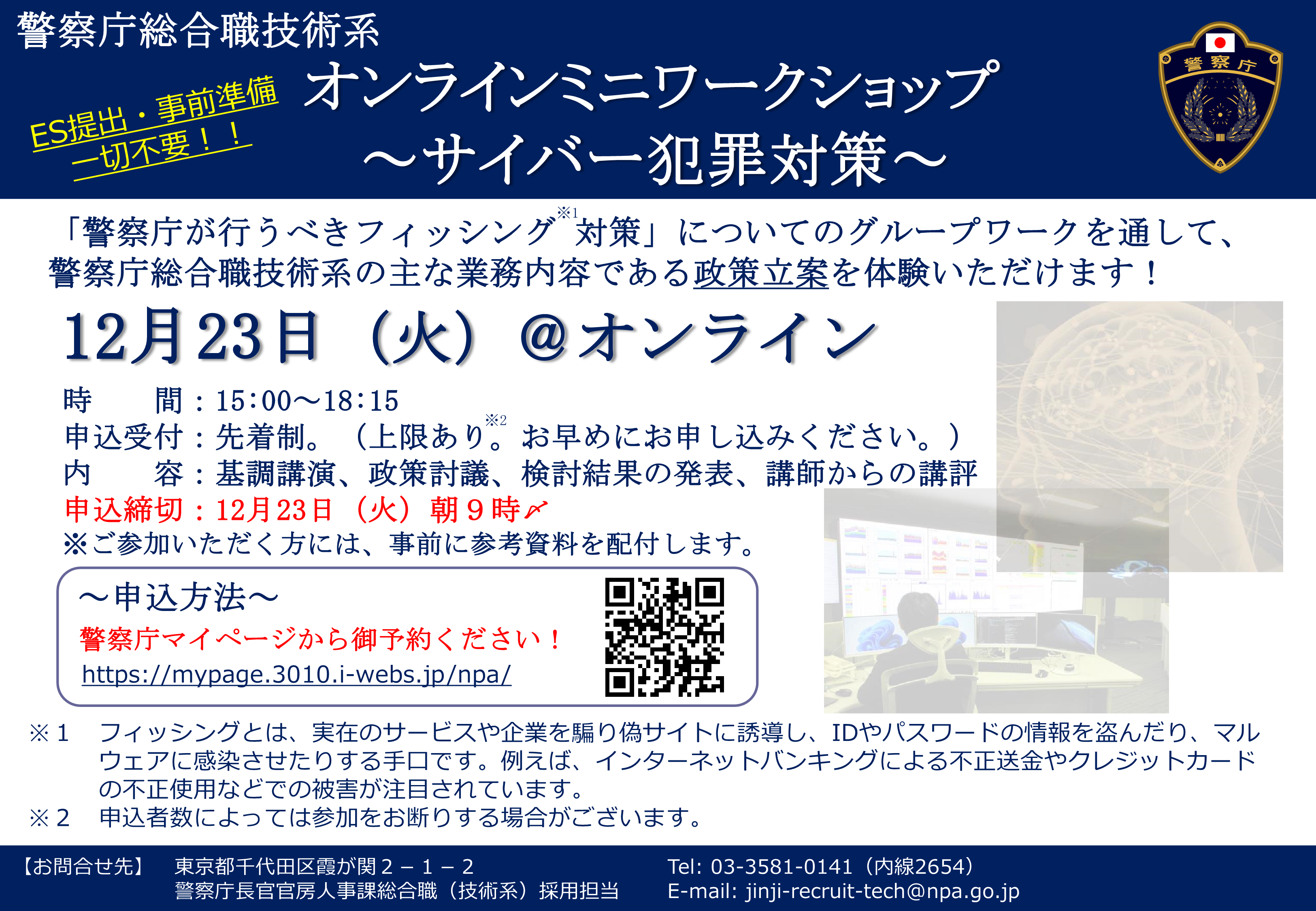 本イベントは、警察庁総合職技術系の業務への理解を深めていただくことを目的としたものであり、採用選考プロセスとは一切関係ありません。