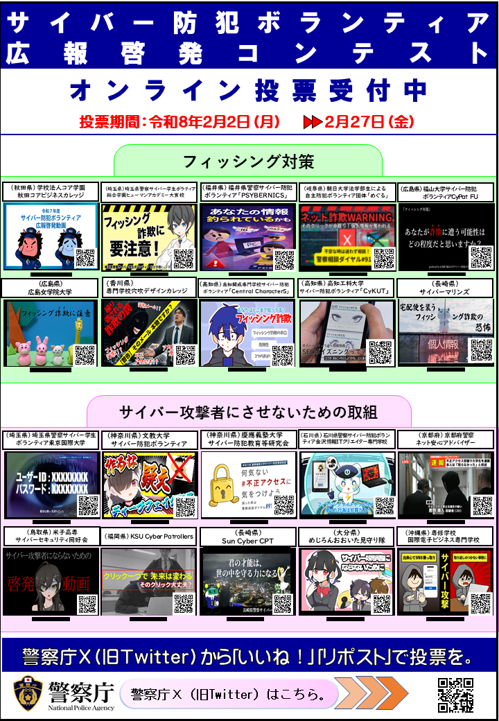 全国のサイバー防犯ボランティアが作成した広報啓発動画(フィッシング対策/サイバー攻撃者にさせないための取組)のうち、予備審査を通過したそれぞれ10作品を警察庁X(旧Twitter)にて掲載しており、現在、オンライン投票を受付中です。 (「いいね」「リポスト」で投票できます。 )