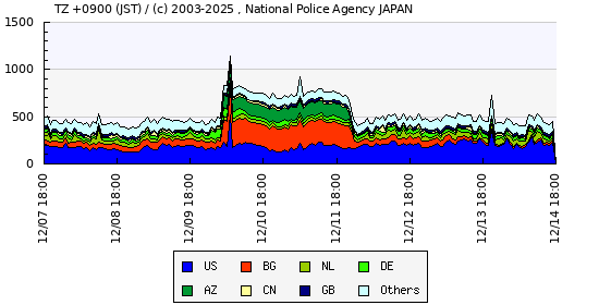 上記のグラフは、全国の警察施設のインターネット接続点に設置されたセンサーで観測したアクセス(件数)の平均を集計したものです。一時間毎に更新されるので、インターネットの状況を把握する資料としてご活用下さい。