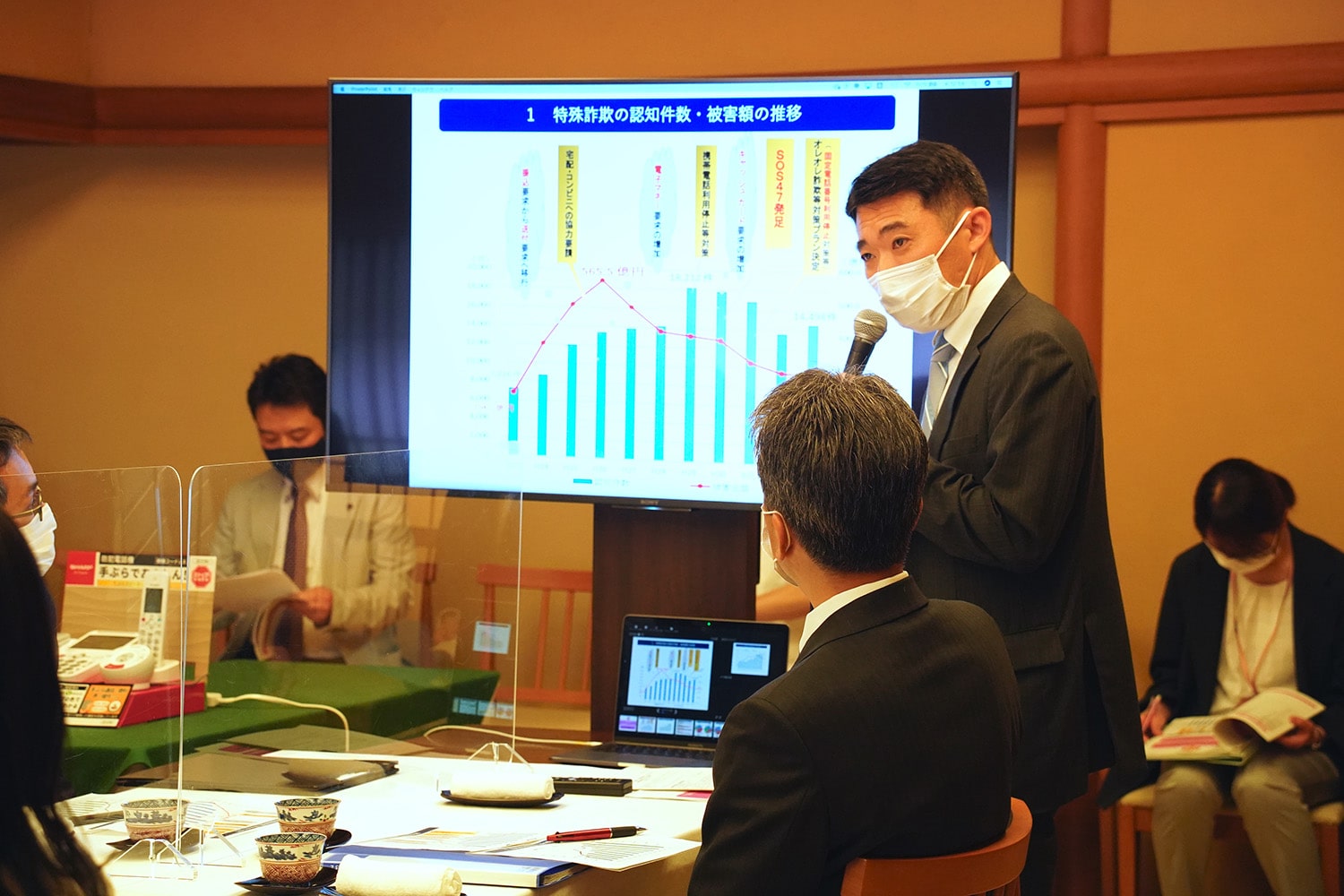 警察庁の中村氏は、「令和3年度の被害額は282億円。これは1日あたり約7,730万円もの被害が発生しているという計算になります。最近は、還付金詐欺が大幅に増加しており、ATMで携帯電話の通話はしない・させない取組や、防犯機能付き電話の設置などの対策が有効です。」と、特殊詐欺被害の情勢やその対策について説明しました。そして、被害防止に向けた情報発信のポイントを挙げて、各支援官に啓発活動への引き続きの協力をお願いしました。