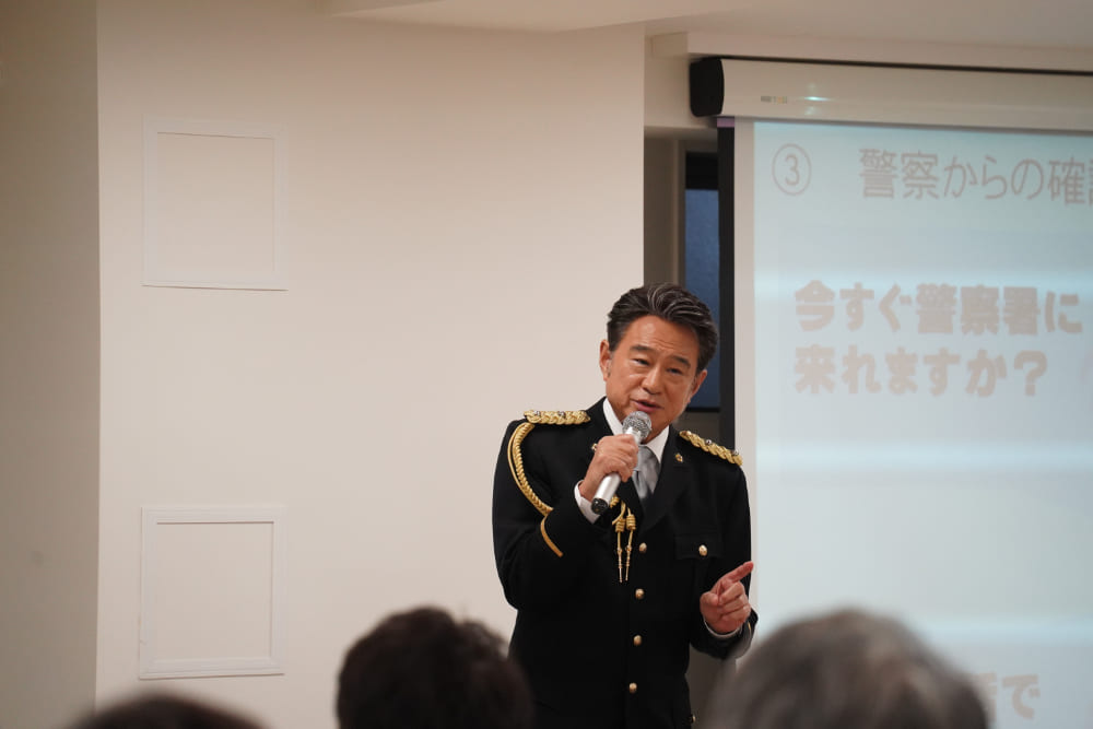 船越支援官は、イベント冒頭、昨今の特殊詐欺の莫大な被害額について触れると同時に、「特殊詐欺全体の被害額のうち約67%が警察官を騙ってだまし取る、いわゆる『ニセ警察詐欺』というものなのです」とその手口についても紹介しました。