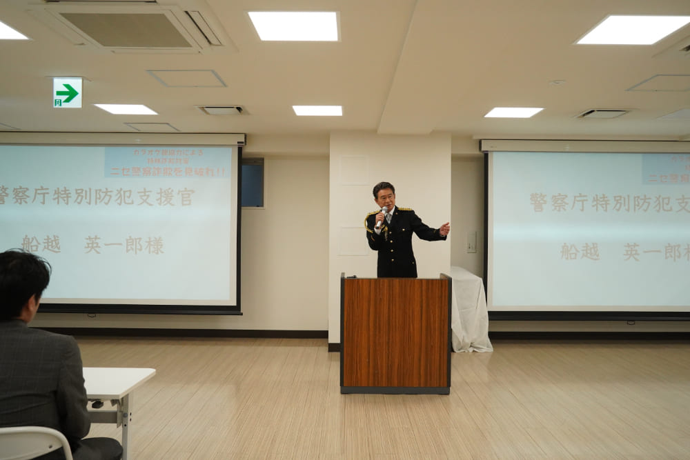 また、イベント後半では参加者から船越支援官に質問するシーンも見られ、「先ほどのお話で、カラオケボックスの中も特殊詐欺に利用されるケースもあるとのことでしたが、お店側としてどのようなことに気を付ければよいでしょうか?」という質問に対し、船越支援官は「被害に遭っている人が利用している可能性があると思うことが大切です。少しでも様子がおかしいと思ったら警察に相談してほしいです」とその対策について語った。