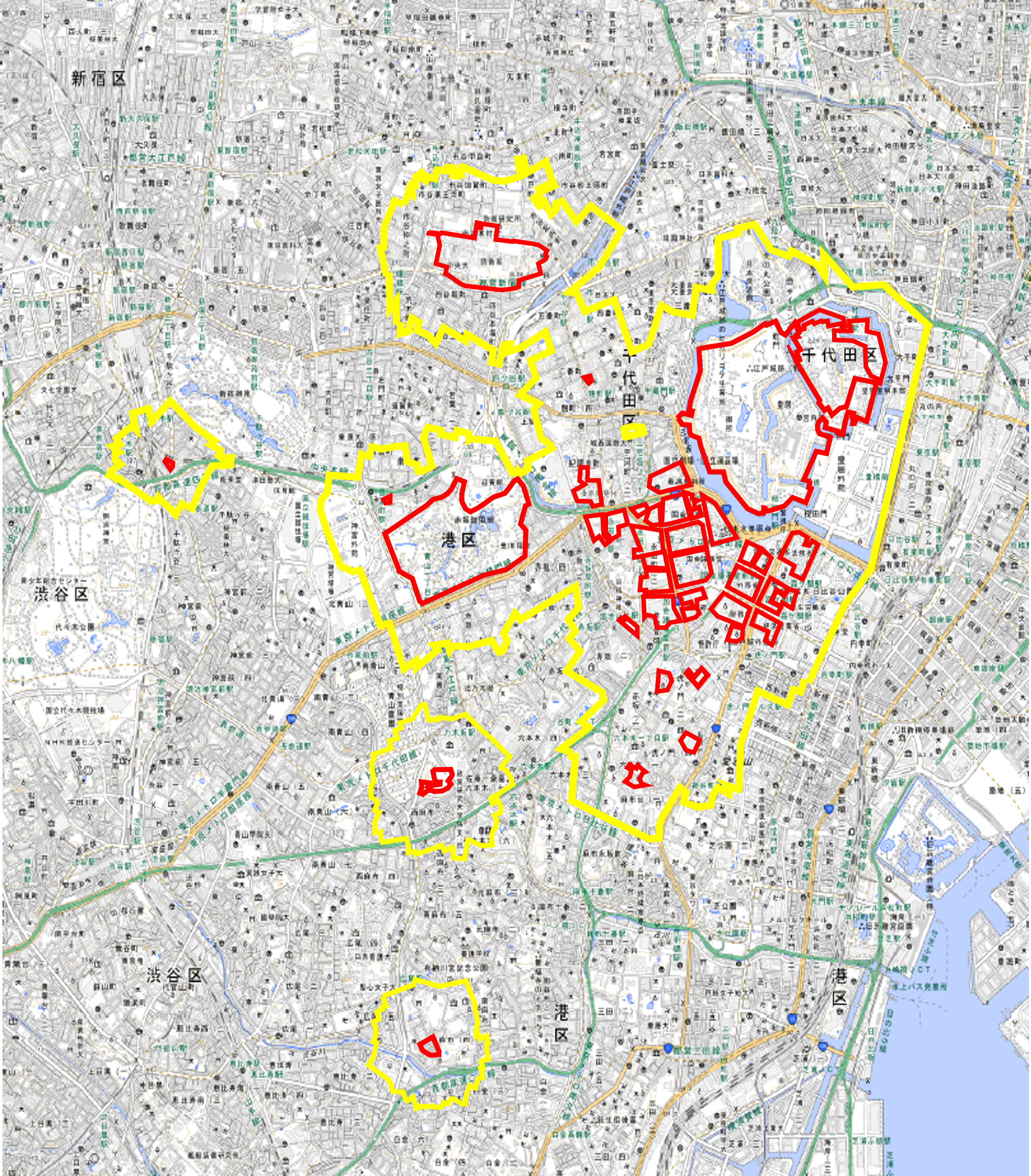 東京都心部における対象施設周辺地域図