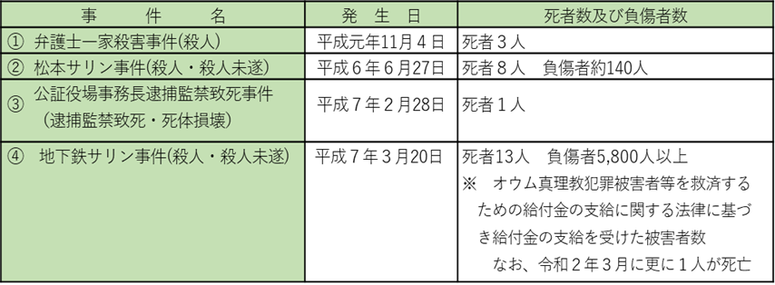 オウム真理教(以下「教団」という。)は、かつて、宗教法人を隠れ蓑にしながら武装化を図り、松本サリン事件(平成6年6月27日)、地下鉄サリン事件(平成7年3月20日)等、数々の凶悪事件を敢行しました。