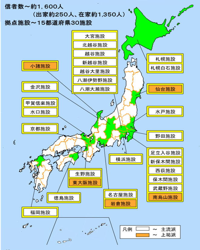現在、教団は、15都道府県に30か所の拠点施設を有し、信者数は、その活動状況等から合計で約1,600人(出家約250人、在家約1,350人)とみられます。