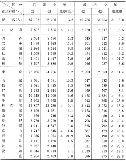 統計4-4 刑法犯少年、触法少年(刑法)の都道府県別人員(昭和62、63年)
