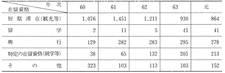 関与外国人女性の在留資格別状況をみると、表1-12のとおりで、平成元年では、観光等の短期滞在が864人(55.8%)と最も多く、次いで興行278人(18.0%)、就学等の特定の在留資格213人(13.8%)となっている。また、これを5年前の在留資格別状況と比べると、就労が直ちに違法となることが多い短期滞在が73.3%から55.8%へと減少し、就労が可能で比較的長期滞在が可能な興行及び特定の在留資格が、それぞれ7.2%から18.0%、4.4%から13.8%へと、かなり増加していることが注目される。