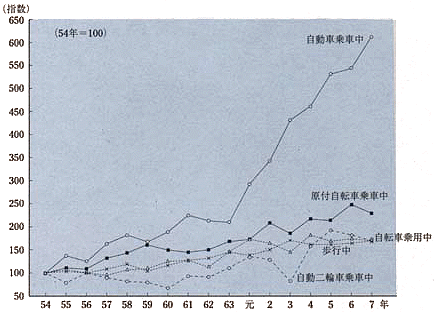 第2次交通戦争という呼称が定着して久しい。平成7年もまた、交通事故死者は1万人を超え、交通人身事故件数は史上最多を更新した。1日平均2,000件を上回る人身事故によって、2,500人を超える人が被害に遭い、うち約30人が亡くなっているという事態は、まさに「戦争」の様相を呈している。