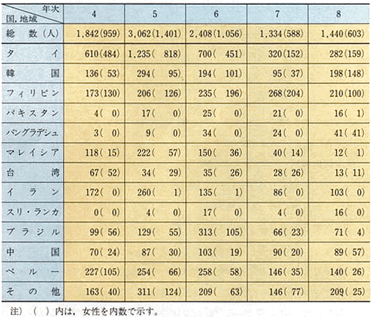 8年中に風俗関係事犯に関与した外国人女性は934人である。国、地域別では、タイ人が316人と最も多くなっているなど、依然として東南アジア諸国の女性が多くなっている(表8-9)。