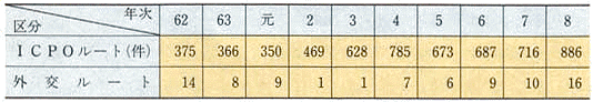 過去10年間に警察庁が行った国際犯罪に関する情報の発信、受信の総数は、表8-12のとおりである。また、国際捜査共助法に基づき外国からの要請に応じて捜査共助を実施した件数は、年々増加しており、その大半はICPOルートである(表8-13)。