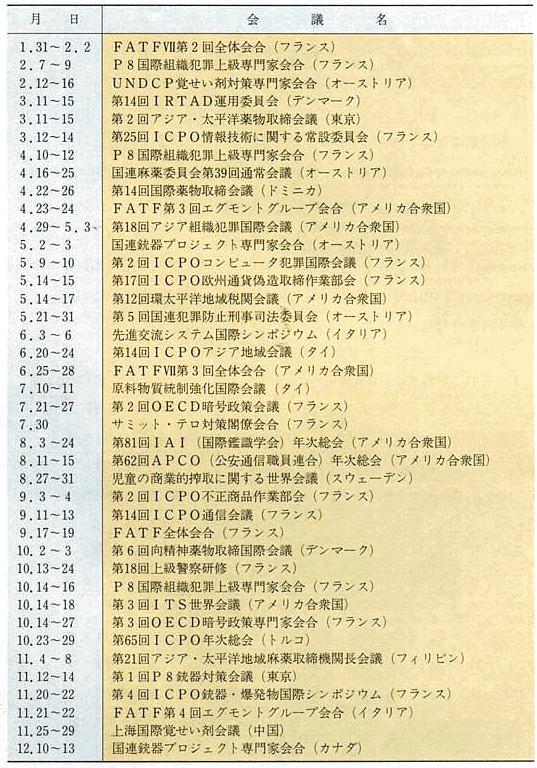警察庁では、これらの国際的な取組みに積極的に参加するとともに、特に、銃器の海外から我が国への流入が大きな脅威になっていることにかんがみ、1996年(平成8年)11月、東京において、P8諸国の関係法執行機関等による「P8銃器対策会議」を主催し、各機関相互の協力体制の強化を図った(第3章第3節1(4)ウ(イ)の〔事例1〕参照)。また、犯罪組織からの不正収益のはく奪は最も有効な国際組織犯罪対策の一つであることから、マネー・ローンダリング等不正収益対策の推進にも努めている。