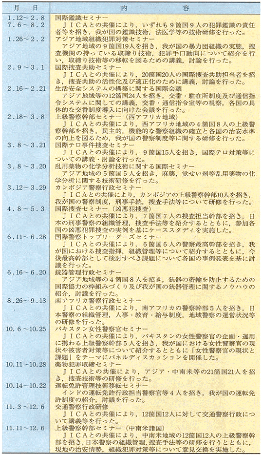 10年中に警察が独自に又はJICAとの共催により実施した主なセミナーは、表1-14のとおりである。特に、同年は、「パキスタン女性警察官セミナー」の中で、パキスタン研修生、部外有識者及び日本で被害者対策に従事している女性捜査官等をパネリストとして、「女性警察官の現状と課題」と題するパネルディスカッションを開催したほか、民主的警察の確立に向けた南アフリカ警察の積極的な取組みを支援するため、8年以降3年連続して「南アフリカ警察行政セミナー」を開催した。