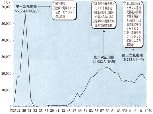 また、社会、経済の急速な国際化の中で、けん銃や薬物の問題でも国際化が進行している。けん銃が大量に密輸入され、一般人がけん銃使用事件の犠牲者となるなどのけん銃を使用した凶悪な事件が多発している。覚せい剤事犯についても、新たに中国で大規模な密造が行われているとみられ、大量の覚せい剤が密輸入されるとともに、イラン人等来日外国人による街頭での無差別密売が行われるなど、覚せい剤乱用のすそ野が広がり、9年ころから、「第三次覚せい剤乱用期」という深刻な事態に陥っている。