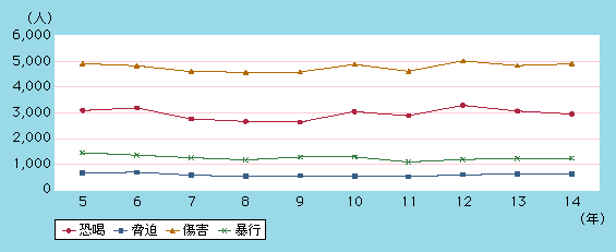 図1-21 暴力団構成員及び準構成員による恐喝・脅迫・傷害・暴行の検挙人員の推移(平成5~14年)