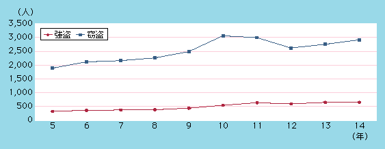 図1-22 暴力団構成員及び準構成員による強盗・窃盗の検挙人員の推移(平成5~14年)