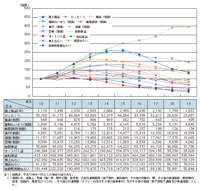 中でも、路上強盗、ひったくり、街頭における強姦、街頭における恐喝、自動車盗、オートバイ盗、車上ねらい、部品ねらい、侵入強盗、侵入窃盗及び住居侵入の認知件数は、いずれも大幅に減少している。