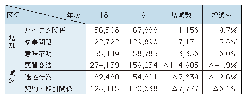 警察に寄せられる相談内容のうち、大きく増加又は減少したものは、表1-17のとおりであり、前年より悪質商法に関する相談等が大きく減少している。