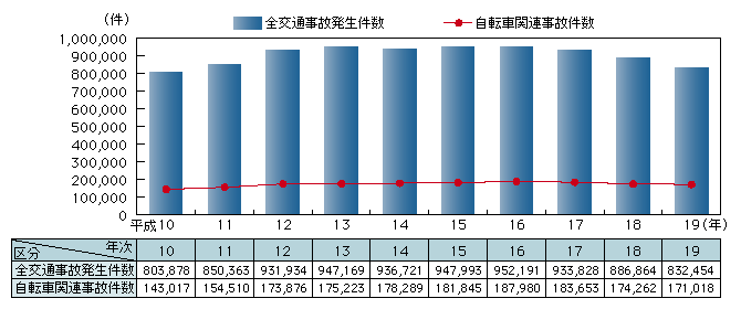図III-1 交通事故発生件数と自転車関連事故件数の推移(平成10~19年)
