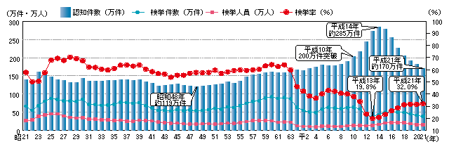 刑法犯の検挙率は、昭和期にはおおむね60%前後の水準であったが、平成に入ってから急激に低下し、13年には19.8%と戦後最低を記録した。その後、14年から上昇傾向となり、21年中は32.0%と、前年より0.5ポイント上昇した。