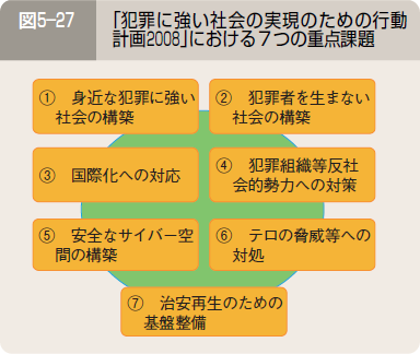 刑法犯の認知件数は、平成8年から14年にかけて、7年連続で戦後最多の記録を更新し続けた。警察庁では、犯罪の増加の基調に早急に歯止めを掛け、国民の不安を解消するため、15年8月、「緊急治安対策プログラム」を策定・公表するとともに、同プログラムを補完・加速化し、治安再生への道筋を確実なものとするため、18年8月、「治安再生に向けた7つの重点」を策定・公表し、これらに盛り込まれた施策を推進してきた。