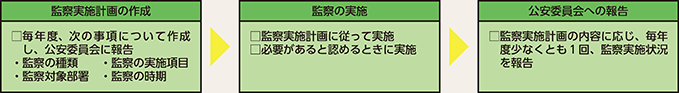 警察庁及び都道府県警察では、その能率的な運営及び規律の保持に資するために、国家公安委員会が定める監察に関する規則に基づき、厳正な監察を実施している。