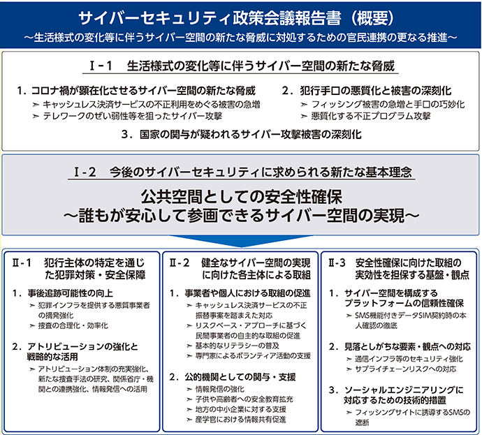 報告書では、スマートフォン決済サービスの不正振替のように、令和2年中に深刻な被害を生じさせた新たな脅威がサイバー空間で顕在化している点や、以前から確認されているフィッシングや不正プログラムによる攻撃の犯行手口等の悪質化、国家の関与が疑われるサイバー攻撃の被害の深刻化等が生じている点等、サイバー空間の脅威が極めて深刻な情勢にあることが共有されるとともに、今後、サイバー空間は、全国民が参画し、重要な社会経済活動が営まれる、これまで以上に重要かつ公共性の高い場へと変貌を遂げていくとの認識が示された。