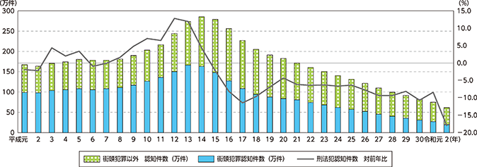 新型コロナウイルス感染症の感染拡大が長期化する中、令和2年4~6月期の国内総生産(GDP)が前期比で実質8.3%の減少となるなど、経済への影響が生じているほか、「新しい生活様式」の実践等が呼び掛けられたことを受け、多くの人が外出自粛を意識するようになる(注1)など、感染拡大は、様々な社会情勢の変化をもたらしており、犯罪情勢にもその影響の一端とみられる動向を垣間見ることができる。