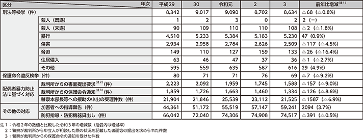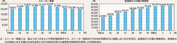 注:平成25年6月に成立した配偶者暴力防止法の一部を改正する法律の施行に伴い、平成26年1月3日以降、生活の本拠を共にする交際(婚姻関係における共同生活に類する共同生活を営んでいないものを除く。)をする関係にある相手方からの暴力事案についても計上している。