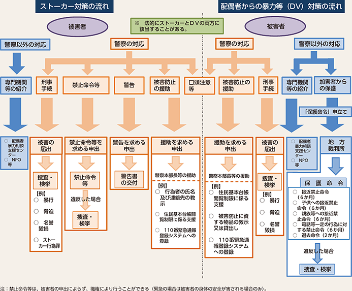 令和3年5月、第204回国会において、ストーカー規制法の一部を改正する法律が成立し、同年8月までに施行され、被害者等が現に所在する場所の付近における見張り等や、GPS機器等を用いた位置情報の無承諾取得等が新たに規制の対象となった。警察では、新たに規制の対象とされた行為に対する適切な対処を含め、引き続き、被害者等の生命・身体の安全の確保を最優先に、組織的な対応を推進している。