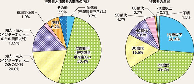 令和3年中の私事性的画像(注1)に関する相談等の件数(注2)は1,628件であった。このうち、被害者と加害者の関係については、交際相手(元交際相手を含む。)が50.4%、インターネット上のみの関係にある知人・友人が20.0%を占めており、また、被害者の年齢については、20歳代が39.7%、19歳以下が26.4%を占めている。さらに、私事性的画像被害防止法の適用による検挙件数は47件、脅迫、児童買春・児童ポルノ禁止法違反等の他法令による検挙は242件であった。