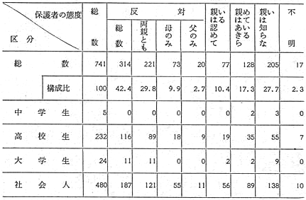 また、同じ青少年にその保護者の態度を聞いた結果は、表4-7のとおりで、親はグループに加入していることを認めていると答えている者が約1割、親はあきらめていると答えている者が2割弱及び親は自分がグループに加入しているのを知らないとする者が3割弱あるのが注目される。