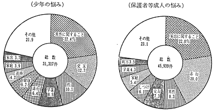 相談内容は、図4-24のとおりで、非行問題のみに限らず、性、学業、進路、健康等多種多様な問題に及んでいる。少年の場合には、異性との交際の問題等異性に関することが22.4%と最も多く、次いで交友関係、性関係の順であり、成人では、子供の家出に関することが22.0%と最も多く、次いで非行関係、異性関係の順となっている。