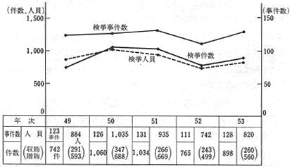昭和53年の風俗犯の認知件数は、前年に比べ819件(9.0%)減の8,265件であった。罪種別にみても、賭博、猥褻(わいせつ)は前年に比べ減少している。