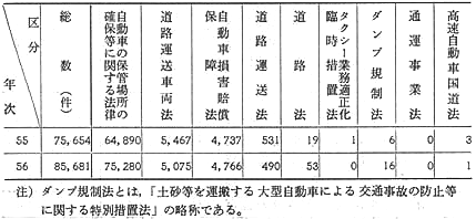 また、下命、容認違反については、自動車の使用制限処分を行っており、56年には、無免許運転で61件、63台、積載制限違反で50件、65台、過労運転で8件、8台それぞれ処分を行った。
