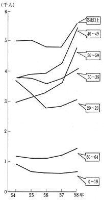 最近5年間の年齢層別自殺者数の推移をみると、図1-18のとおりで、40、50歳代の壮年層の自殺が一貫して増加傾向にあり、特に、58年の増加が著しい。