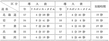 昭和58年以前に一括してこのシステムを導入した5道県警察について、導入前後のリスポンス・タイムを比較してみると、表1-2のとおりで、導入後のリスポンス・タイムは著しく短縮されている。