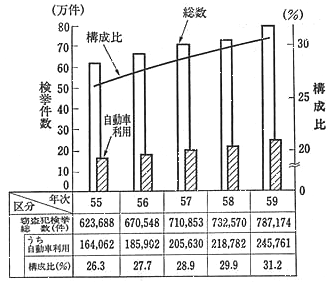 図1-1 自動車利用の窃盗犯の検挙状況(昭和55~59年)