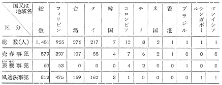 最近は、フィリピン人の増加が著しく、60年以降は、全体の過半数を占めるに至っている。また、暴力団等による職業あっせん事犯や在留期間延長をねらった偽装結婚事犯、偽造旅券事犯等悪質、巧妙な事犯も見受けられる。