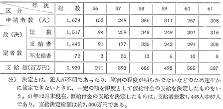 また、同基金では、重障害を受けた犯罪被害者に対する見舞金の給付事業も行っており、61年12月末までに、23人に対し、770万円を給付している。