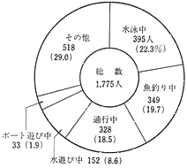 死者、行方不明者を発生場所別にみると、図8-1のとおりで、海と河川で全体の約7割を占めている。また、行為別にみると、図8-2のとおりで、水泳中や魚釣り中が多い。特に、無謀ないそ釣りによって高波にさらわれたり、釣船が転覆する事案等が目立った。