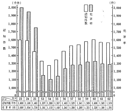 刑法犯認知件数は、近年、増加の傾向を示していたが、61、62年は続けて減少した。