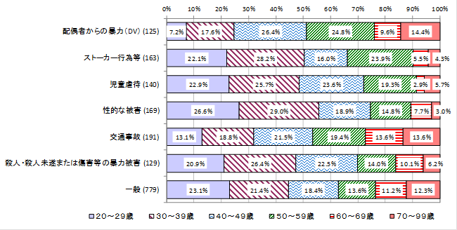性的な被害、児童虐待、ストーカー、殺人・傷害で年齢が比較的若く、20~30歳代が約半数を占める。一方、DV、交通事故は年齢が高く、40歳代以上で2/3以上を占める。 一般対象者では、各世代が比較的均等に回答している。