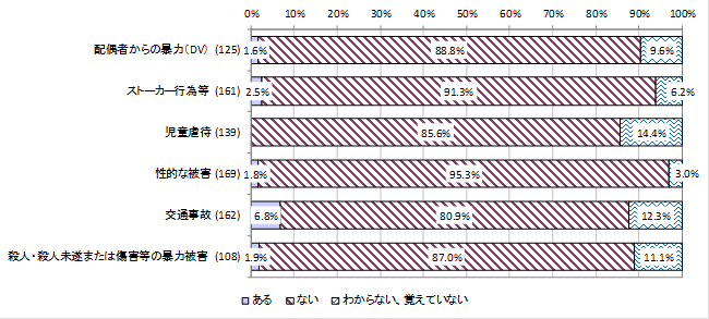 DVでは「配偶者、元配偶者」(100%)、ストーカーでは「交際相手、元交際相手」(26.4%)、「全く無関係の人、知らない人」(22.1%)、「職場、アルバイト先の関係者、通っていた学校の関係者」(19.0%)、「わからない」(14.1%)、「知人、友人」(12.9%)、児童虐待では「父」(56.4%)、「母」(30.7%)、性的な被害、交通事故は「全く無関係、知らない人」(それぞれ75.1%、87.8%)、殺人・傷害は「全く無関係、知らない人」(31.0%)、「職場、アルバイト先の関係者、通っていた学校の関係者」(13.2%)、「兄弟姉妹」(11.6%)、「知人・友人」(10.9%)の回答比率が高い。