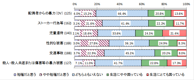 同じく経済的状況の変化では、悪化基調との回答比率は、DV(30.4%)、殺人・傷害(26.0%)で高い。「事件に関連する問題によって悪化した」との回答比率はDV(63.2%)、殺人・傷害(50.0%)、交通事故(48.0%)で高い。