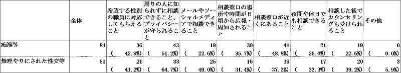 その他の施策ニーズとして、社会全体で犯罪行為を発見したら通報・相談をするよう促進する広報活動、とるべき具体的を一緒に考えてくれること、精神不安者による犯罪を起こさせないような加害者メンタルケア等が挙げられた。これらの意見は児童虐待、DV、ストーカー行為等の被害者から多く出されていることが特徴である。