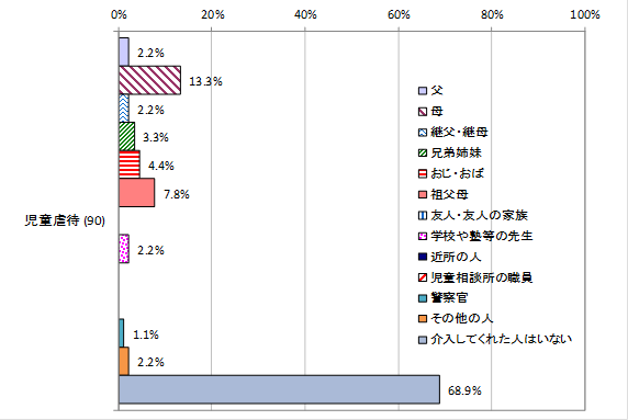 <児童虐待の被害者>大人になっても虐待の傷は癒えない、永遠に苦しむ、鮮明に苦痛を覚えている、子供の時に受けた傷はその人の将来に少なからぬ影を落とす、年齢を重ねるほどフラッシュバックが多くなる、苦しめられた年数に比例して立ち直りにくくなる、いまだにまっすぐ人の目を見て話すことができない等の意見がみられる。