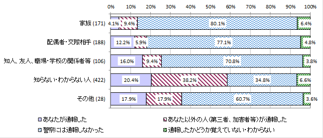 警察へ通報した(「あなたが通報した」と「あなた以外の人が通報した」との回答の和)との回答比率(=通報率)は、加害者が「家族」(13.5%)の場合に最も低く、「配偶者・交際相手」(18.1%)、「知人、友人、職場・学校の関係者等」(25.4%)、「知らない人等」(58.6%)と関係性が密接でなくなっていくにつれて、高くなっている。