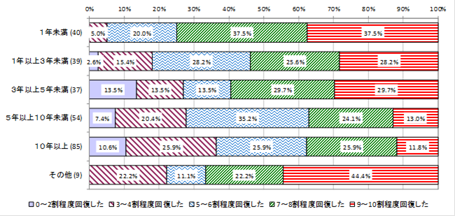 被害の継続期間別にみると、長期にわたって被害を受けていた犯罪被害者等ほど、回復度が低いことがうかがえる(図表2‐123)。